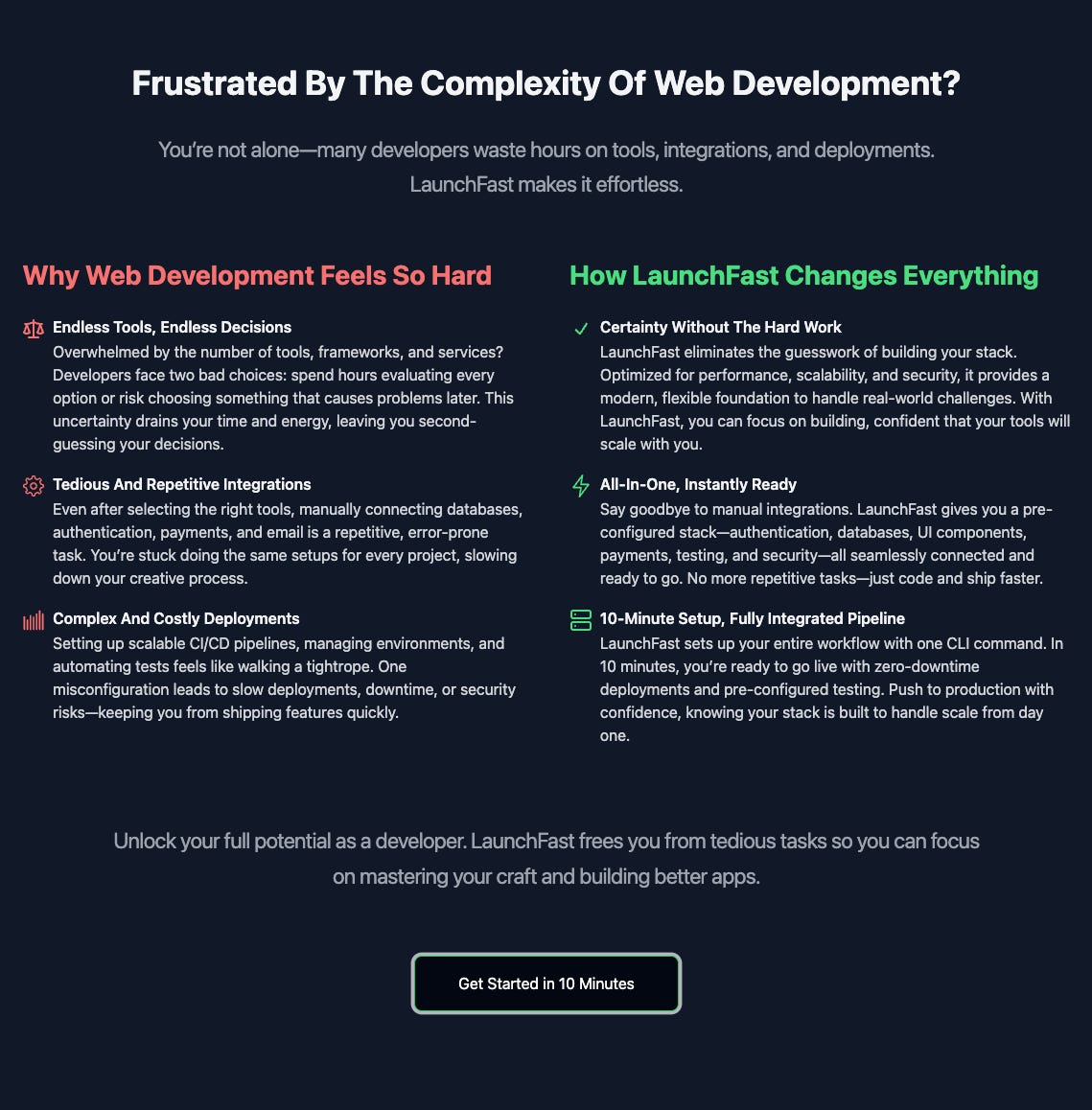 This part went through over 100 iterations – yes, really! At first, I focused on structuring it with a title and two columns: the pain points on the left and the solutions on the right. Then, I zoomed in on every word – title, subtitle, and paragraph – until it was just right. Finally, I zoomed out and checked the flow, tightening the copy along the way.